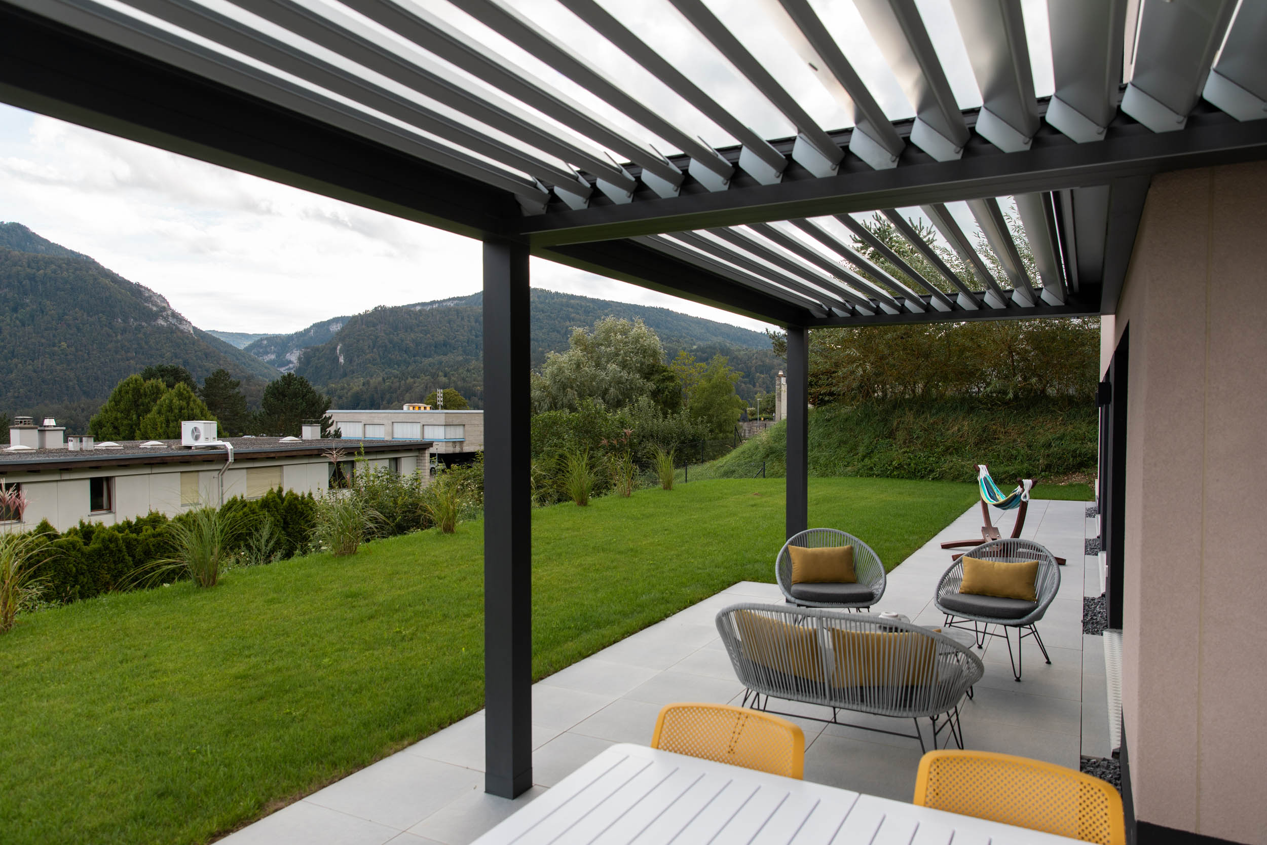 Une pergola à toiture bioclimatique d’angle,